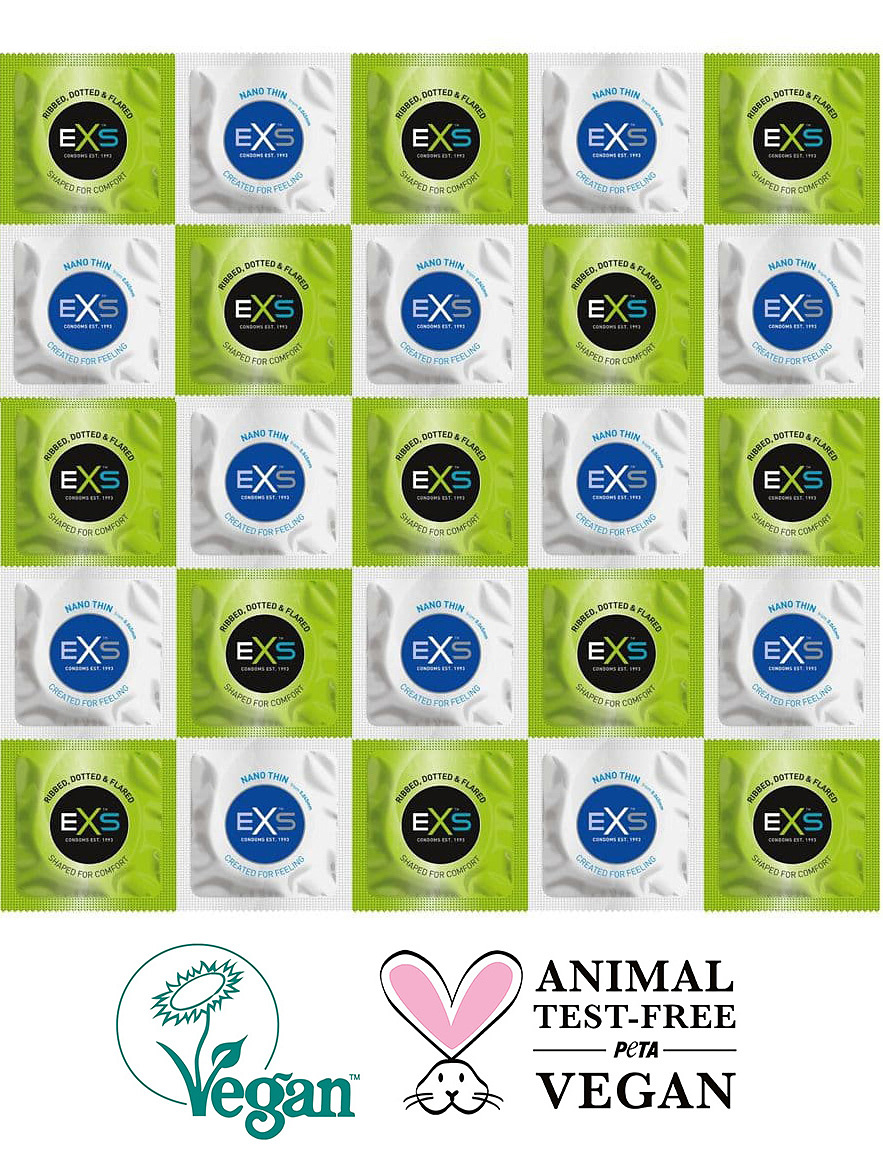 Mixpack med tunna och räfflade/knottriga kondomer för en säker njutning.