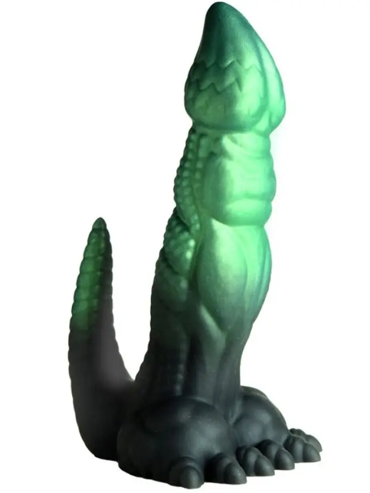 - Unik & färgglad design - Mjuk, flexibel & mycket elastisk silikon - Mjuk & bekväm - Unika detaljer som maximerar din stimulans - Försedd med stark sugkopp Låt dig charmas av denna lekfulla fantasidildo i form av en dinosaurie med tydliga detaljer i grönt och svart. Det koniska huvudet och de noggrant utformade fjällen längs skaftet ger en unik stimulering, medan den extra svansen erbjuder möjlighet till dubbel njutning. Vid basen sitter två karakteristiska dinosauriefötter med klor.Unik dinosauriedesign: Koniskt huvud med stimulerande fjäll och räfflor längs skaftet, samt extra svans för ytterligare njutningStark sugpropp: Fäster säkert på alla släta ytor för hands-free användningSele-kompatibel: Den breda basen passar perfekt i de flesta strap-on selarPremium silikon: Kroppssäkert och ftalatfritt material med optimal balans mellan fasthet och följsamhetTotal längd: 17,8 cmInförbar längd: 15,2 cmDiameter: 3 - 4,4 cmSvans: 7,1 cm införbar längd, 2,5 cm diameterAnvänd endast vattenbaserat glidmedel för att skydda materialet. Rengör noggrant med toycleaner efter användning och låt lufttorka helt. Förvara på sval plats åtskild från andra silikonprodukter.