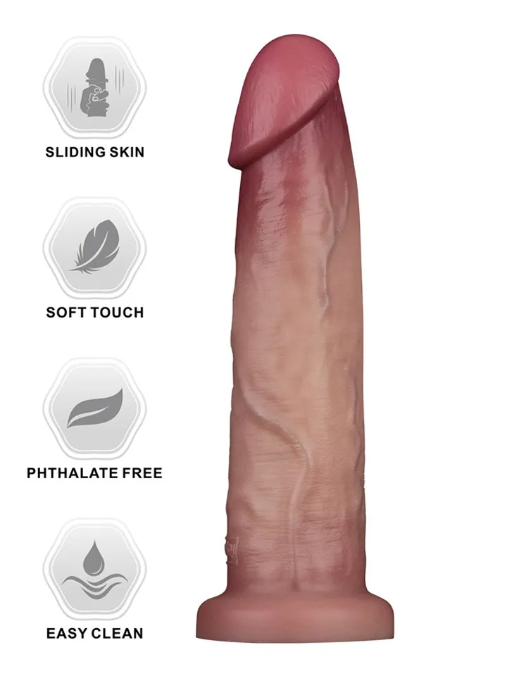 Tillverkad av avancerad sliding-skin silikon erbjuder denna dildo en otroligt realistisk känsla. Den förbättrade dual-density teknologin simulerar känslan av en erigerad penis med en mjukare, mer delikat yttre hud och en tillfredsställande fast inre kärna – en upplevelse som överträffar verkligheten. Produkten är noggrant tillverkad av medicinskt silikon för att efterlikna hudens känsla med enastående detaljrikedom, vilket ger en unik och otroligt realistisk sensation. För bästa upplevelse, använd ett vattenbaserat glidmedel för att förstärka känslan längs den verklighetstrogna skaftet.